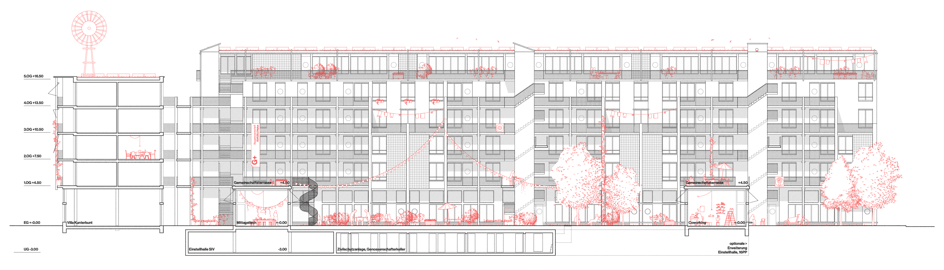 Laubenfragmente bieten auf unterschiedlichen Niveaus Ein-, Aus- und Durchblicke: Wie eine Zuschauertribüne umgeben sie den Hofraum, der zur Bühne des kollektiven Siedlungslebens wird. Die Küchen sämtlicher Wohneinheiten sind um diese Mitte organisiert. Sie sind das dem Siedlungsalltag zugewandte Zentrum der jeweiligen Einheiten, während die hofabgewandten Individualzimmer von der städtischen Kulisse der angrenzenden Strassenräume profitieren. Es entsteht ein städtisches Durchwohnen zwischen Strasse und Hof, das an den unterschiedlichen Qualitäten teilhat.